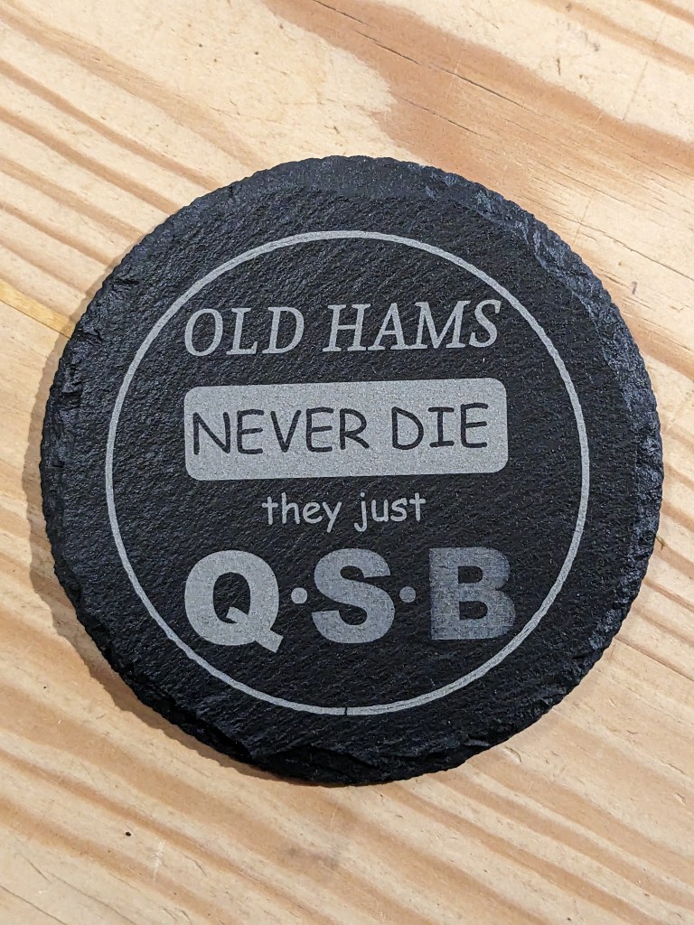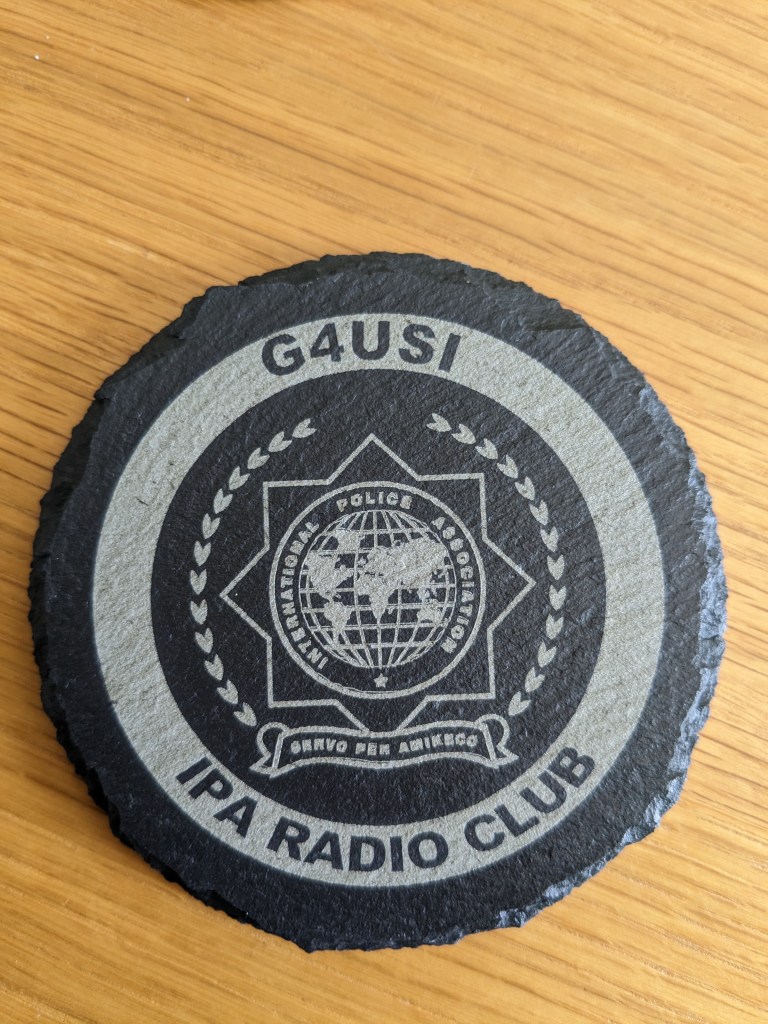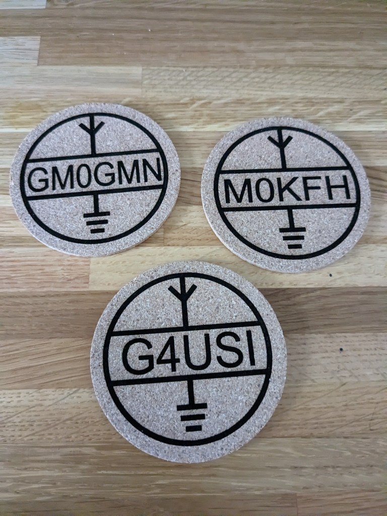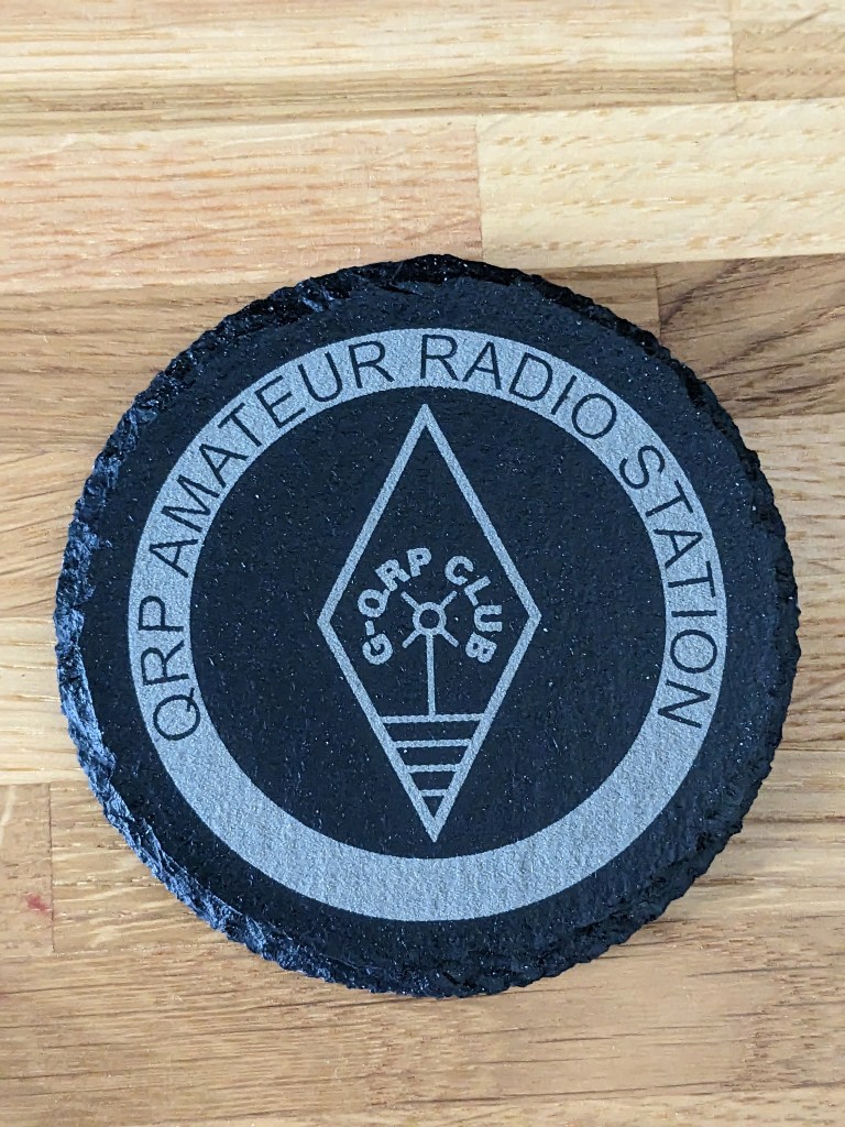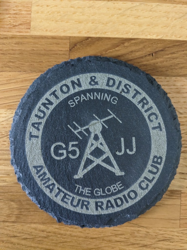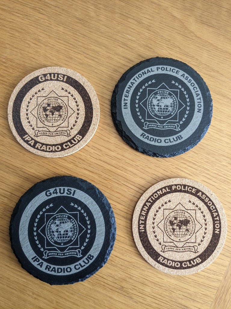 Slate coasters (£5) are approximately 100mm in diameter, whilst cork (£2.50) are approximately 90mm. Given a clear coat of satin lacquer for protection. All can be personalised and contact from clubs with their logo is especially welcomed. A club order can significantly reduce postage costs too!
