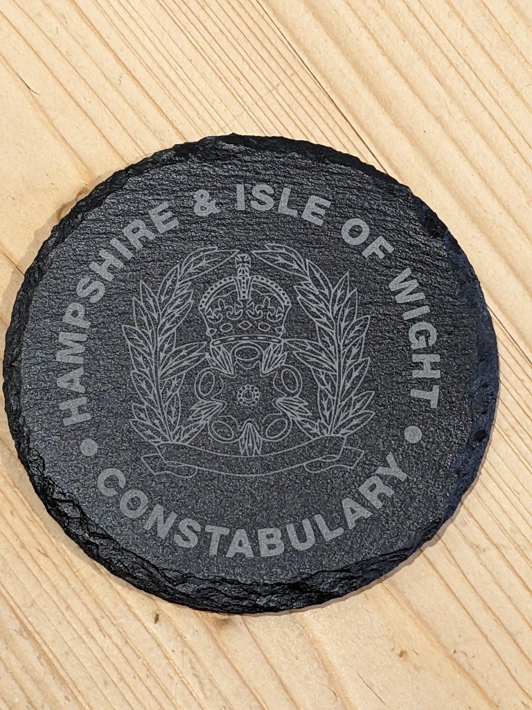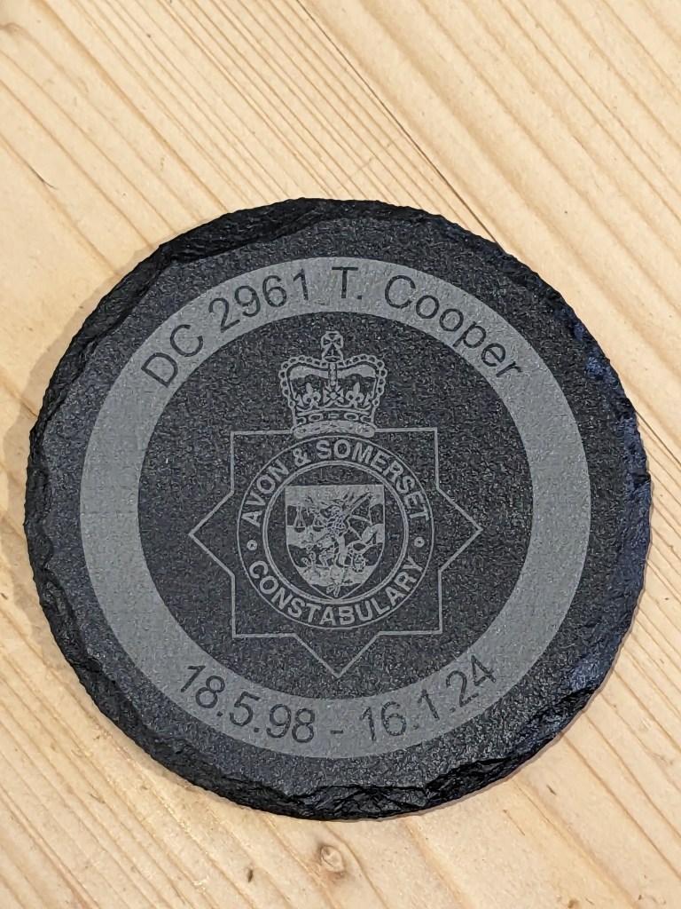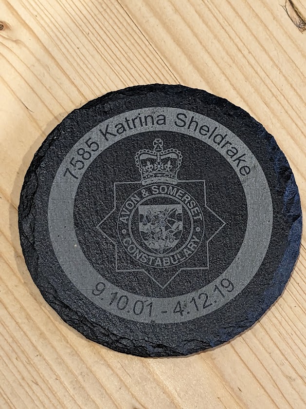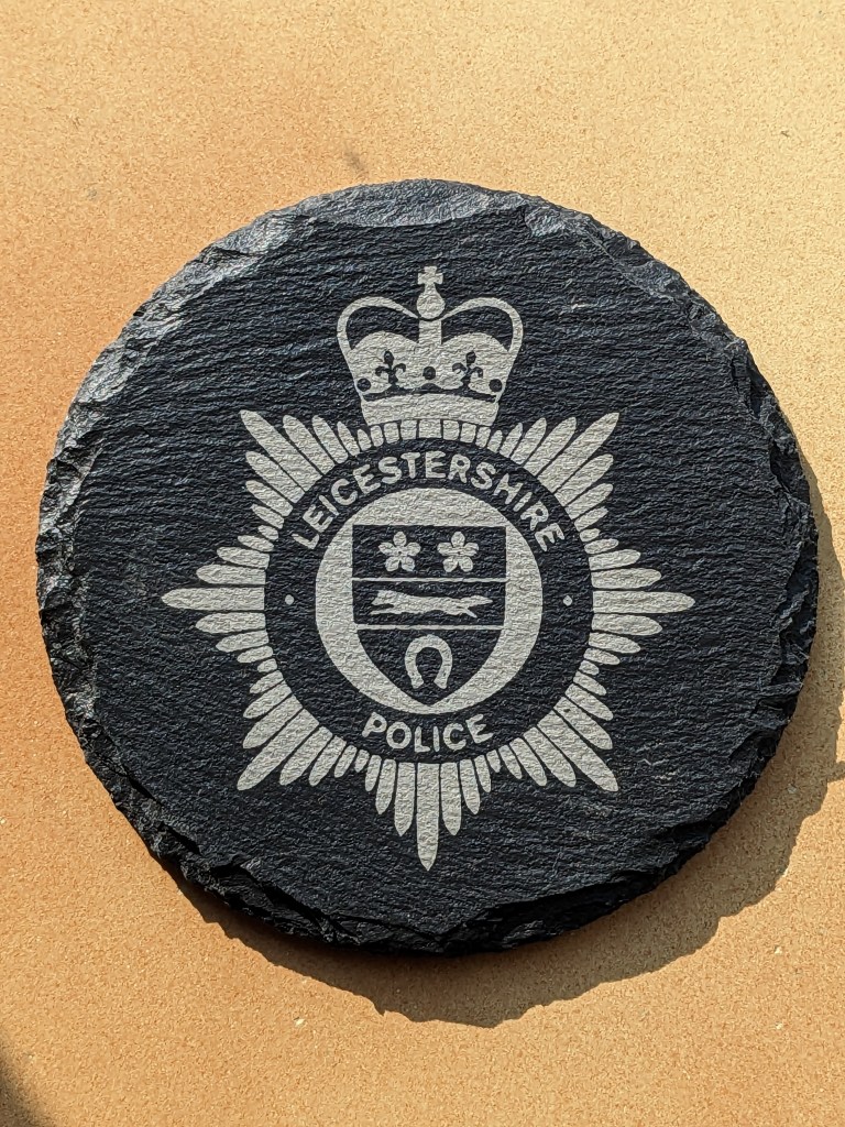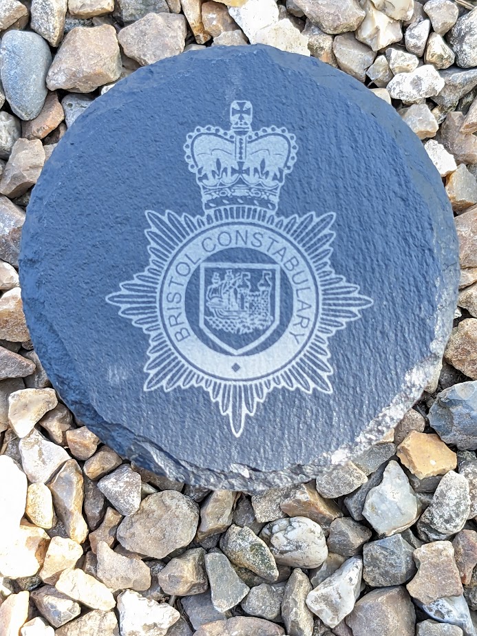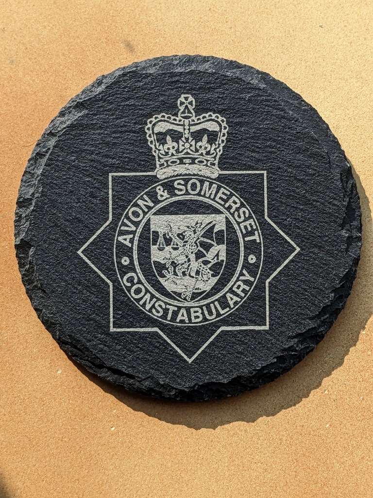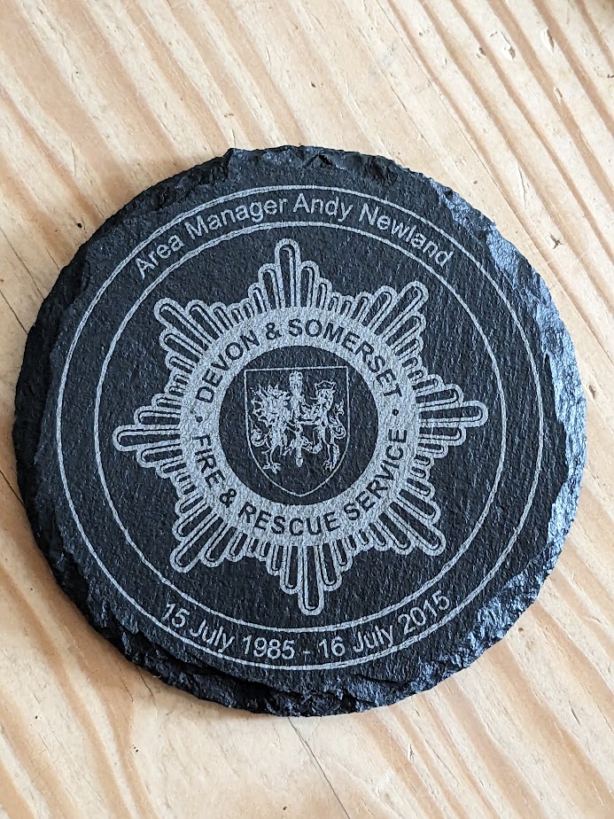 We offer a range of personalised slate coasters to commemorate your service, or that of a friend, colleague or loved one, in the Emergency Services. Each coaster is hand prepared electronically before being laser engraved on slate or cork and then hand lacquered for protection. You can choose merely to have your organisation’s crest boldly centred, or you may wish to have a name and dates of service added around the outer edge – but just about any need can be catered for.